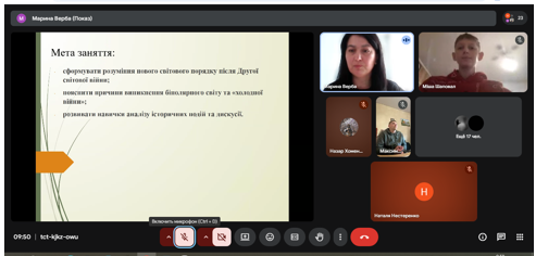 Відкрите заняття спрямоване на формування у здобувачів освіти розуміння особливостей повоєнного світового порядку, розвиток уміння аналізувати історичні події та робити висновки щодо причин і наслідків міжнародних конфліктів, виховувати у дусі патріотизму, національної свідомості та гідності.